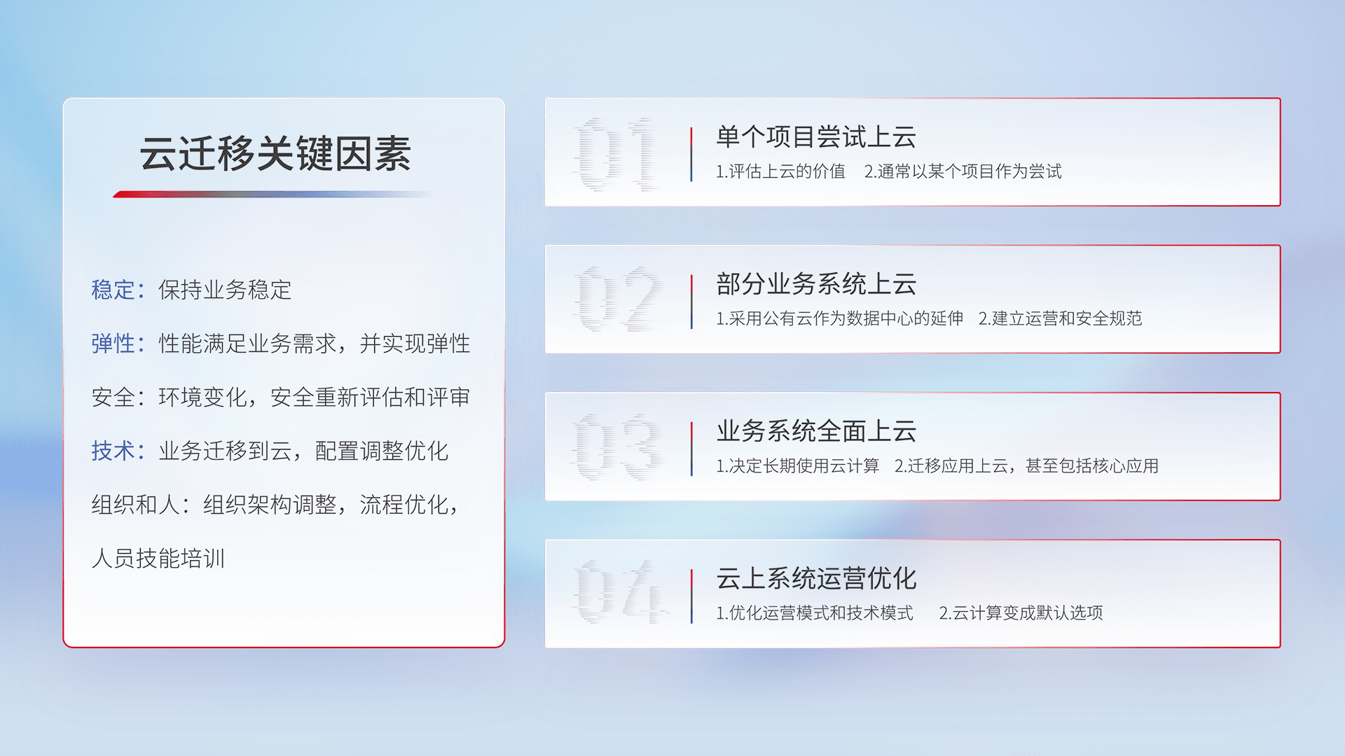 结合实际业务,,,从规划设计、、、云平台选型、、云原生改造、、、数据迁移、、、集成交付,,迁移全过程为客户识别最佳上云路径,,,,做好风险识别管理,,,设计网络架构、、、身份权限、、、安全审计合规、、、、操作审计、、、、日志审计、、监控告警策略、、多站点容灾设计等,,,,对云上基础设施进行整体规划,,,,提升IT治理水平,,,,以满足弹性、、高可用、、高性能的需求。。。