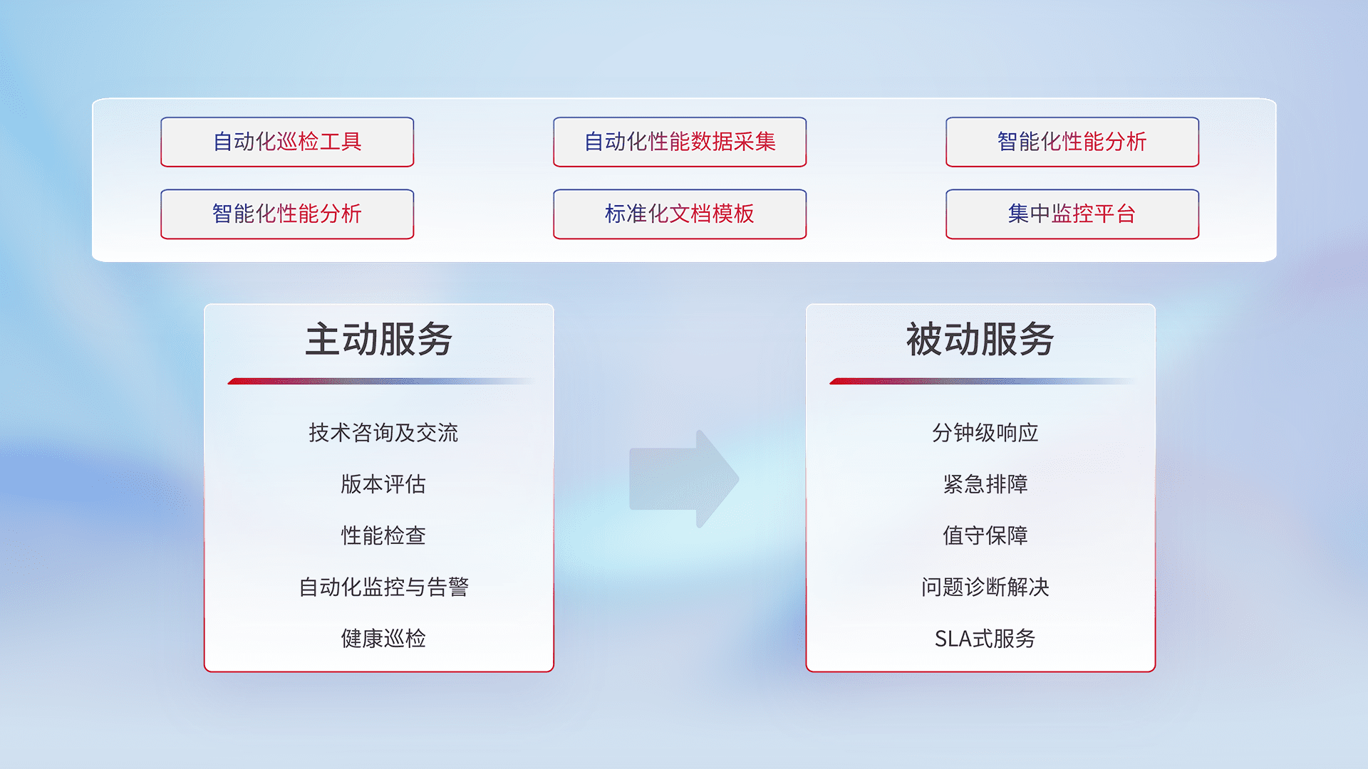 智能化工具和标准化文档,,,,保障服务质量,,,,提供主动服务(包含技术咨询、、版本评估、、、性能检查、、、自动化监控与告警、、、、健康巡检)和被动服务包含(分钟级响应、、、紧急排障、、值守保障、、问题诊断解决、、SLA服务)。。